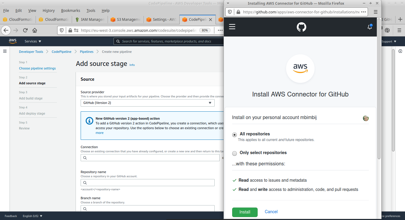 Pour simplifier les choses dans ce tutorial, nous allons autoriser l'accès de AWS à tous les repos de notre compte et laisser "All repositories" coché.