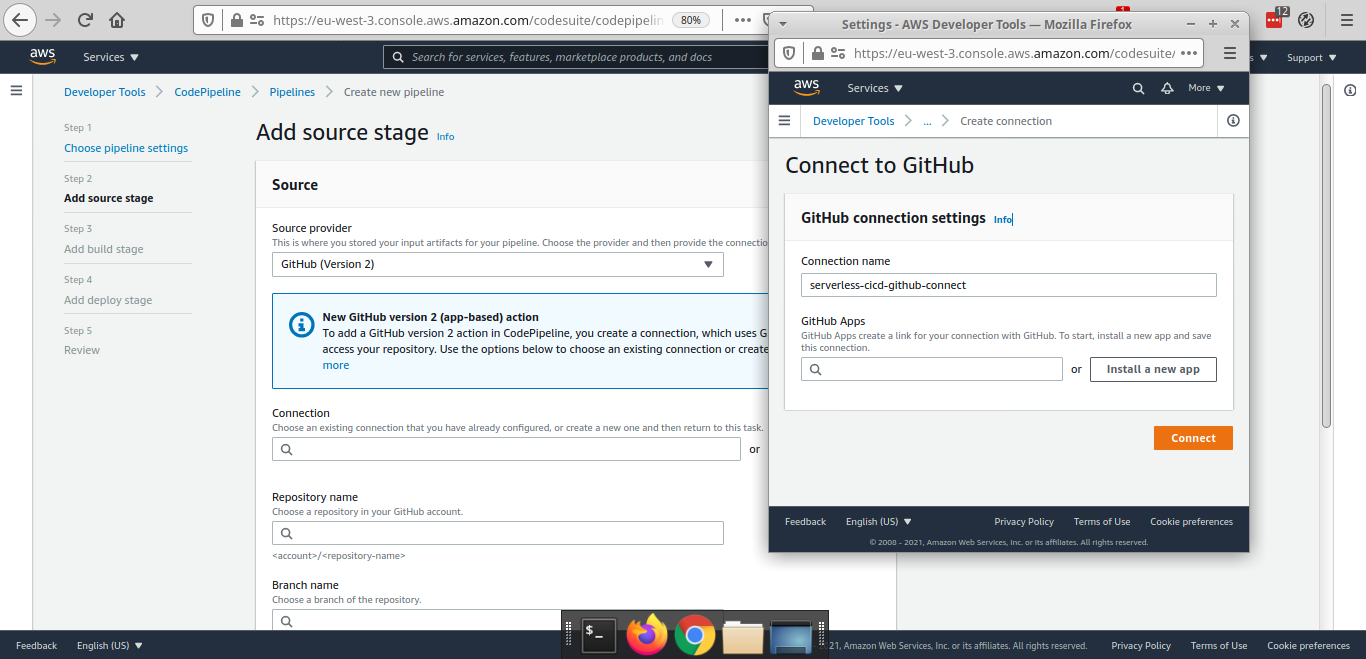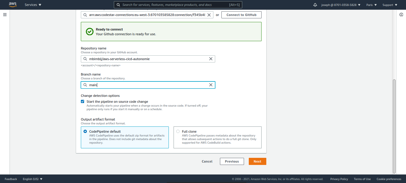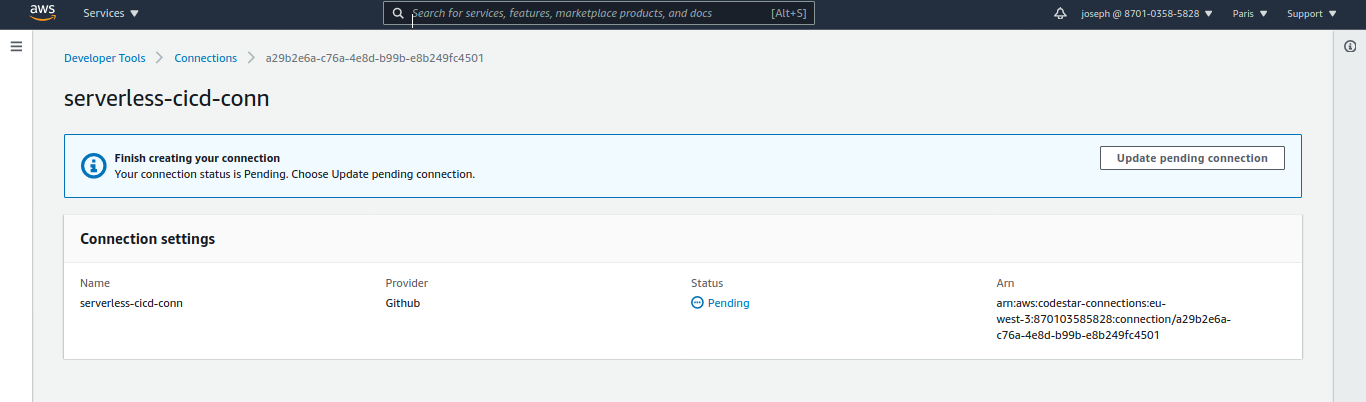 Donnez un nom à la connexion, là aussi, pour rester cohérent avec le nommage "serverless-cicd-XXX", par exemple "serverless-cicd-github-connect" (la longueur du nom de la connexion doit être inférieure à 32 caractères)