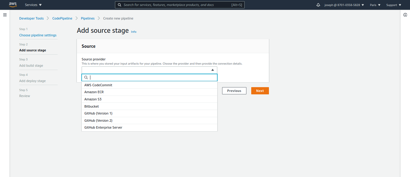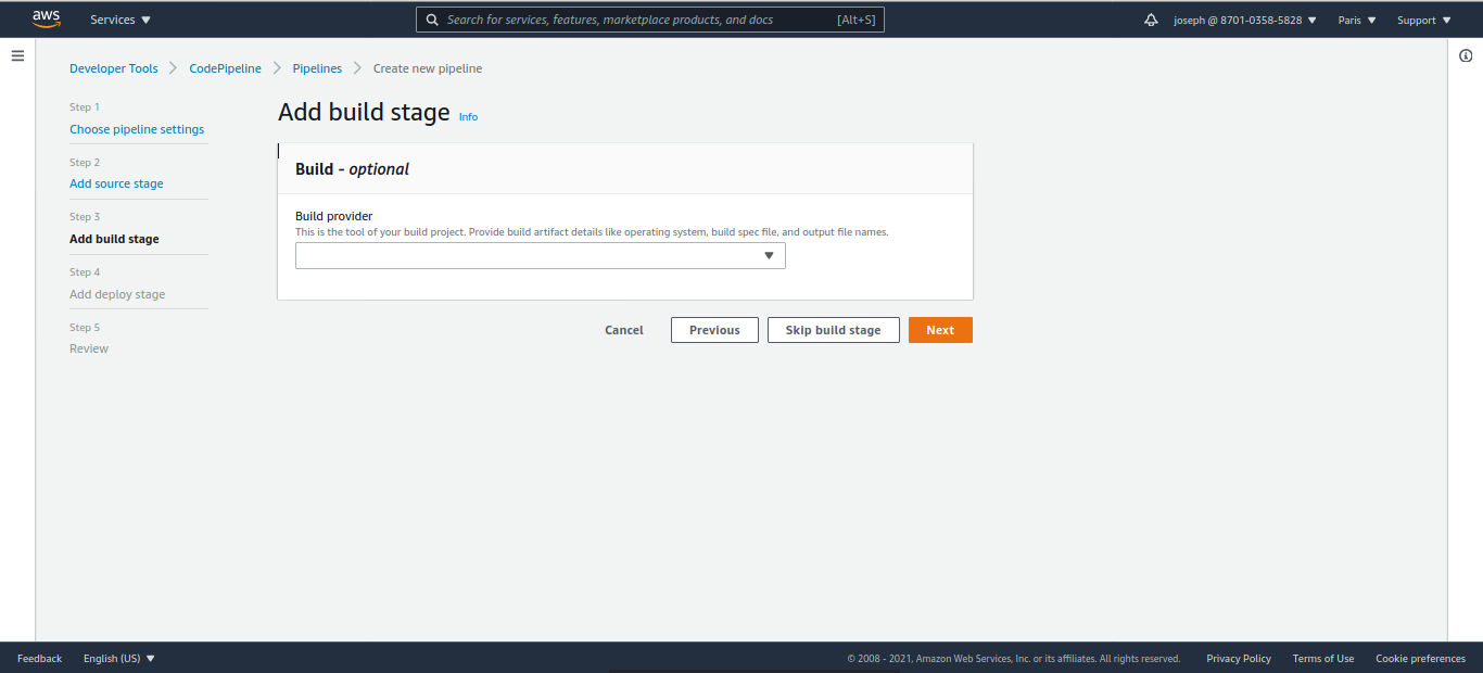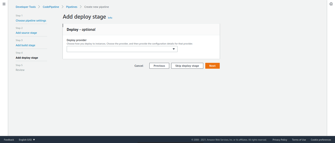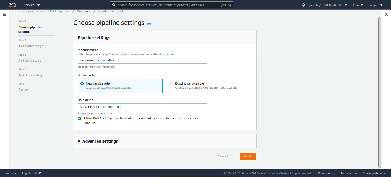Laissez coché "Allow AWS CodePipeline to create a service role so it can be used with this new pipeline"