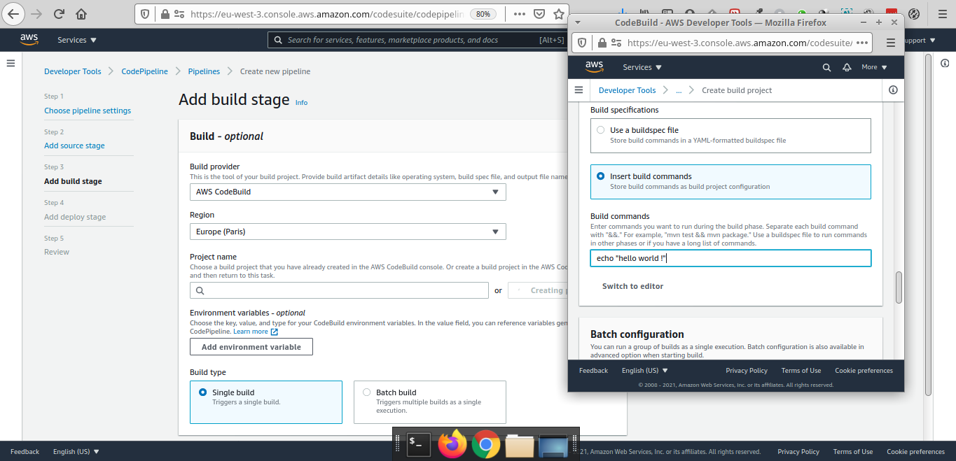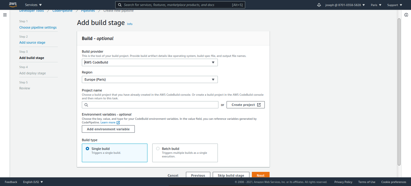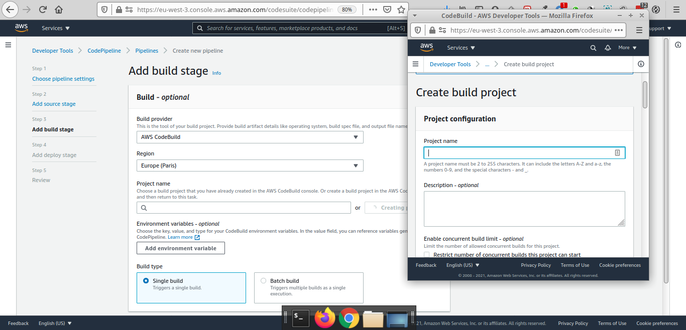 On s'occupera de créer un projet CodeBuild