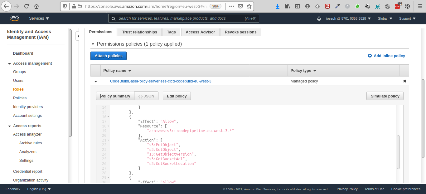 Corrigeons cela: remplacez "arn:aws:s3:::codepipeline-eu-west-3-*"
