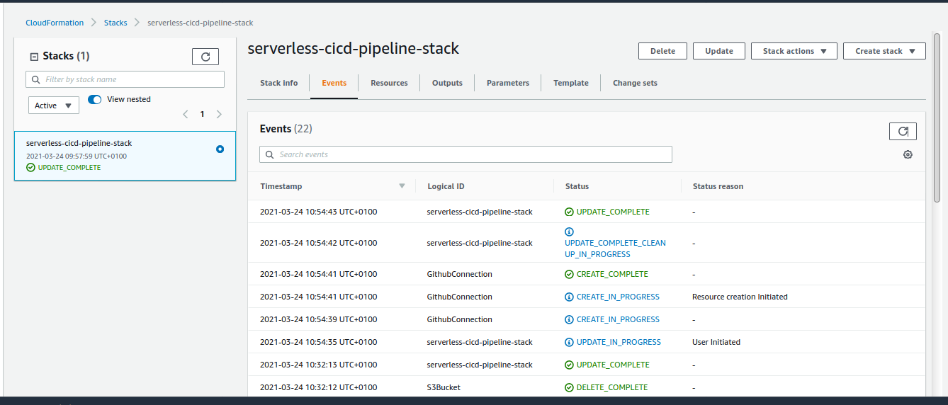 Après update de la stack (ne pas oublier d'activer la connexion github), on a un début de pipeline pleinement fonctionnel