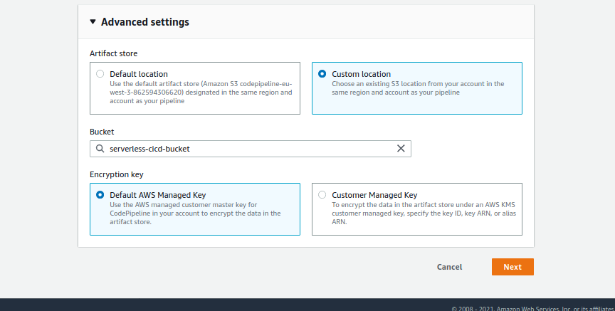 Ensuite, dans "Advanced Settings", "Artifact Store", sélectionnez "Custom Location" et sélectionnez le bucket "serverless-cicd-bucket"