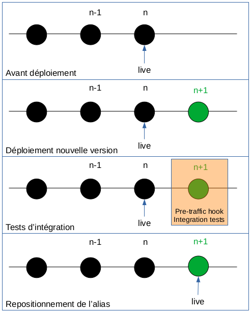 . Cependant, avant de rediriger le traffic vers cette version, nous avons configuré l'éxécution de tests automatisés. Si jamais les tests échouent, l'alias n'est pas repositionné sur la nouvelle version et le traffic n'est donc pas redirigé.